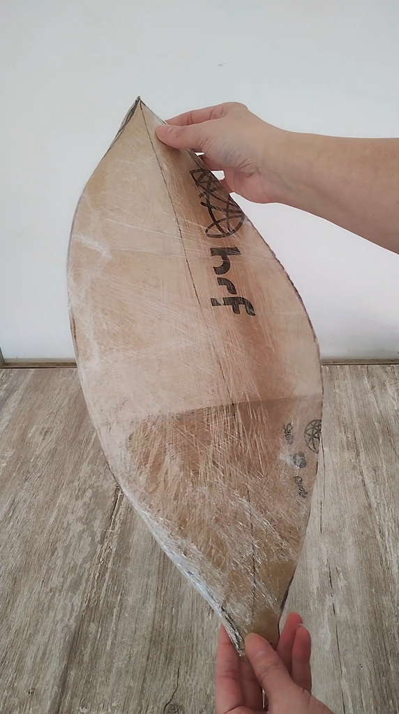 Feito isso, recorte e passe plástico filme, envolvendo a superfície na frente e no verso: